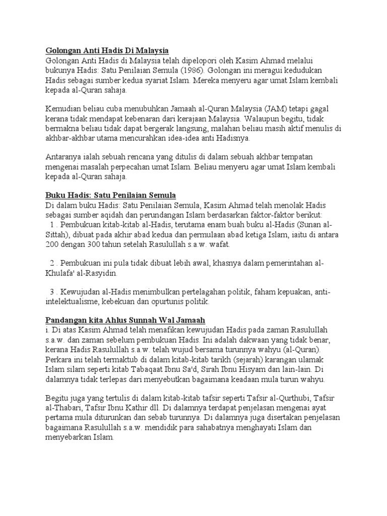 Mereka menyeru agar umat Islam kembali kepada al. Pemikiran anti-hadith di Malaysia dipengaruhi daripada seorang pemikir Islam di Amerika Syarikat yang bernama Rashad Khalifa. 2 Pertama kelompok yang menolak hadith-hadith Rasulullah saw.